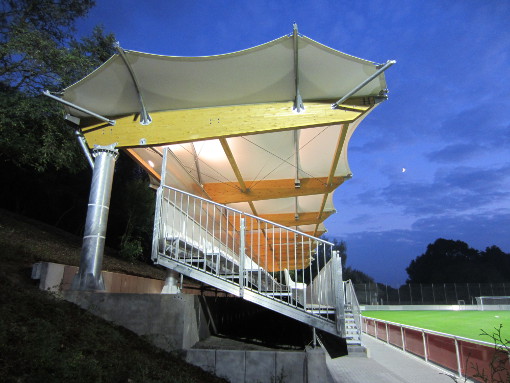 Tribünenüberdachung 7m auskragende Holzbinder/Membran Dach